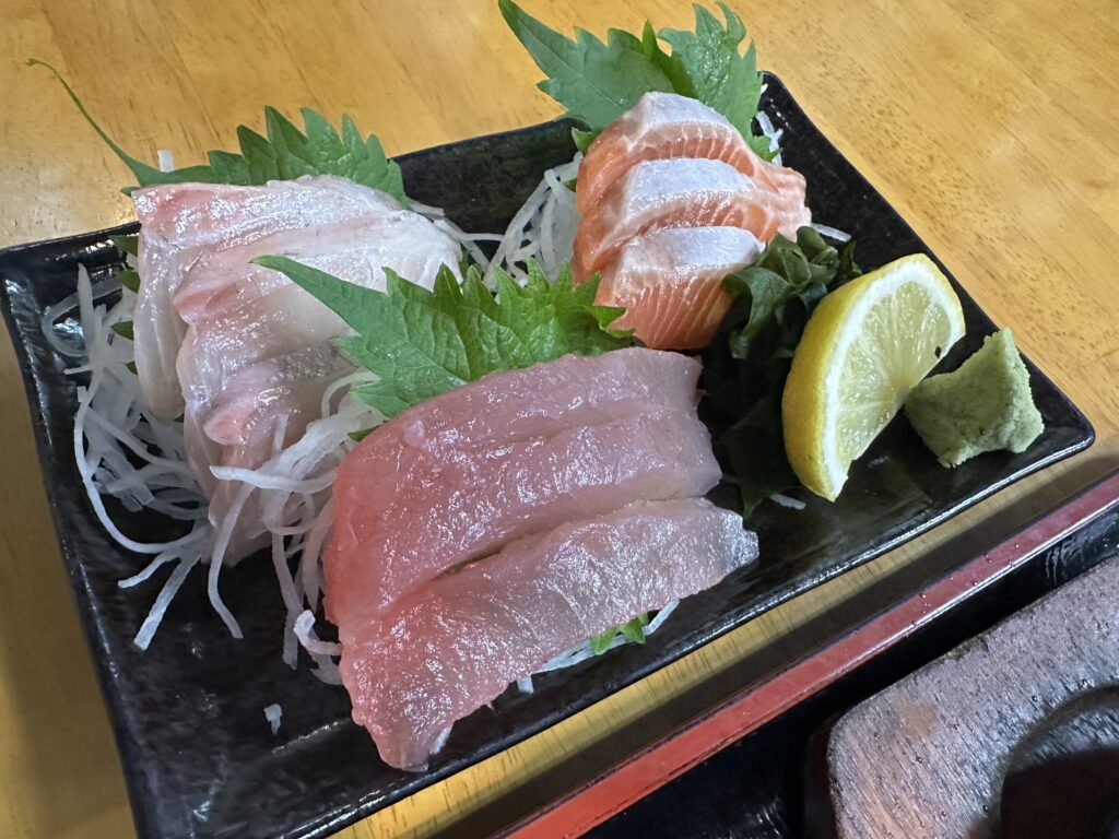 その中でも今回は魚のバター焼き定食をオーダー。+お刺身の盛り合わせ(小) そうしたら魚のバター焼きはいつものやつが終わってしまって、ぐるくんのビックサイズしかないと言う事。 じゃあそれで!って言ったのは良いものの、(時価って書いてあったね)